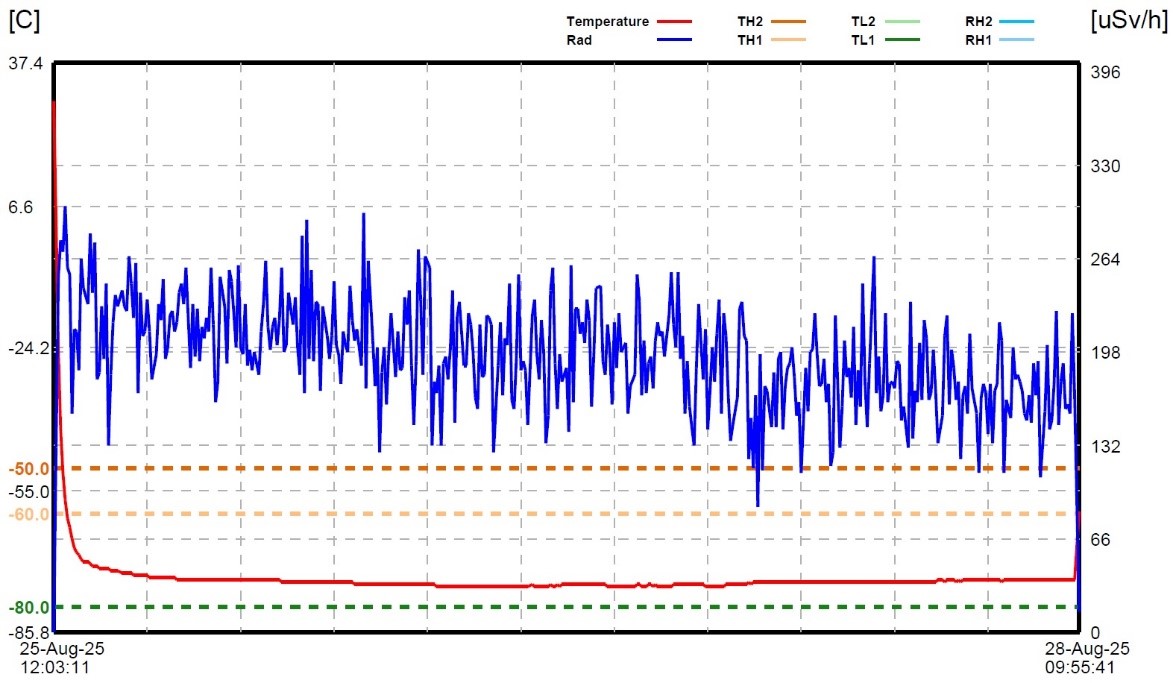 To address these challenges, we developed a data logger capable of continuously measuring and recording both temperature and radiation dose throughout the entire transport process. The device integrates high-precision temperature sensors and radiation detection modules within a compact, lightweight design that allows easy installation inside or outside transport containers without interfering with routine logistics operations. Importantly, the data logger operates reliably under extreme cryogenic conditions below –70 °C and offers a battery life exceeding 10 days, ensuring stable, long-term functionality even during extended transport durations or unexpected delays. This capability significantly improves resilience for both domestic and international shipment scenarios.